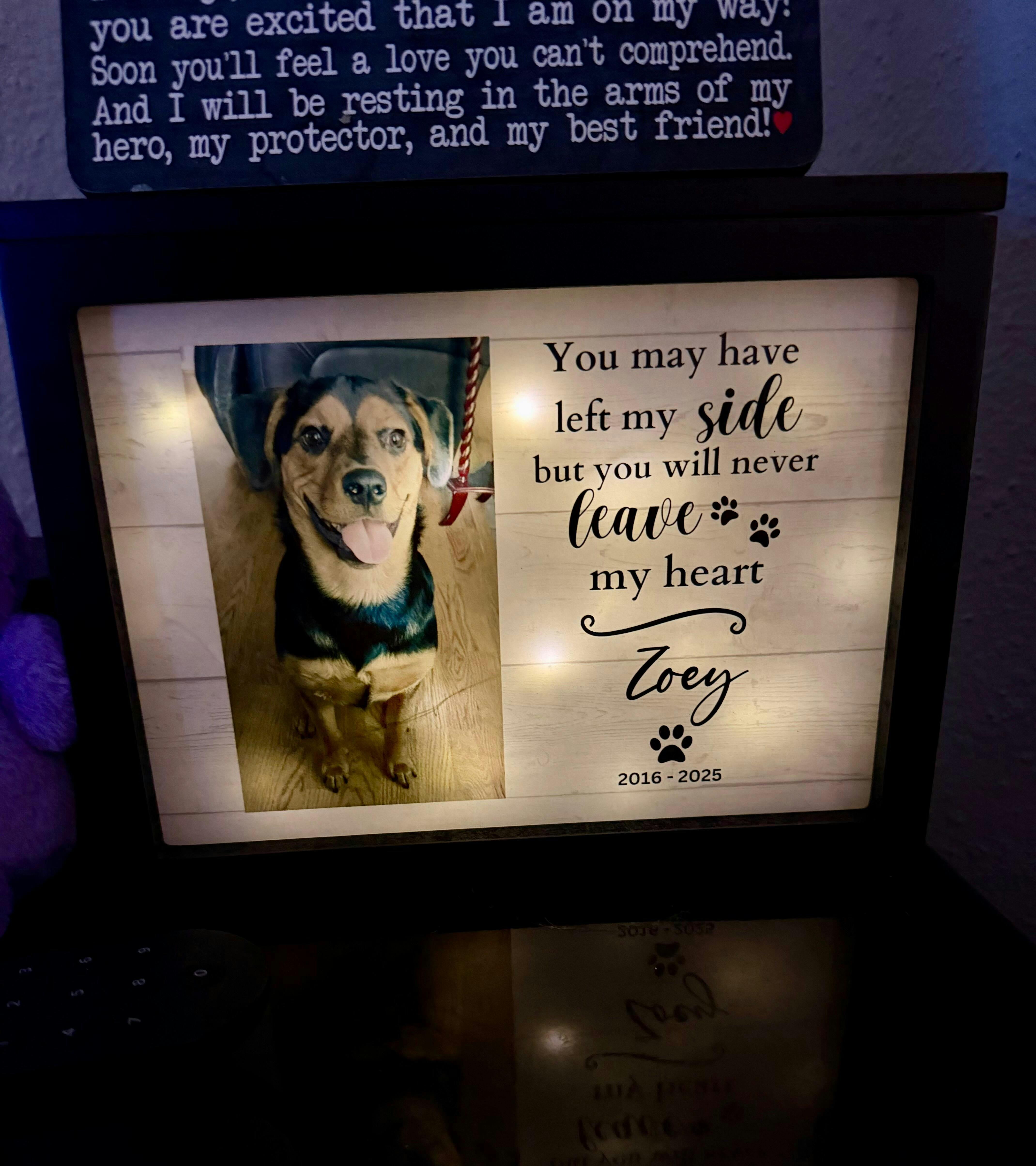 Words can’t explain or put into context how much this piece means to me. Thank you so much for the quality work. The kind letter and a sense of Peace for Zoey